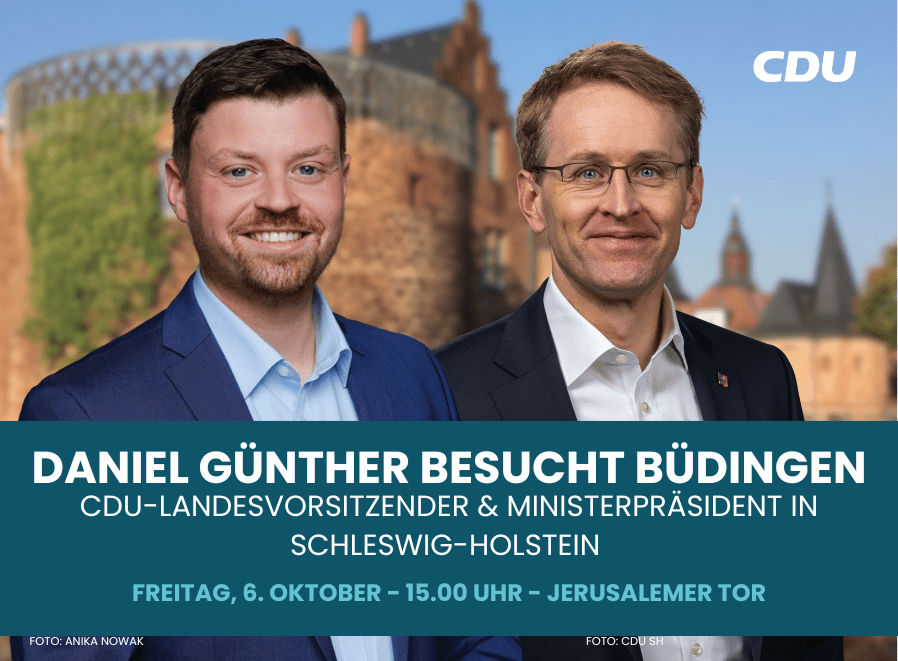 Am kommenden Freitag, 6. Oktober 2023, besucht Daniel Günther, Landesvorsitzender der CDU und Ministerpräsident in Schleswig-Holstein, Büdingen. Gemeinsam mit CDU-Landtagskandidat Patrick Appel und Landrat Jan Weckler startet der Rundgang durch die historische Altstadt um 15.00 Uhr am Jerusalemer Tor. „Ich freue mich, dass Daniel Günther meiner Einladung nach Hessen gefolgt ist und gemeinsam mit uns die ehemalige Kreisstadt Büdingen kennenlernen kann“, so Patrick Appel.